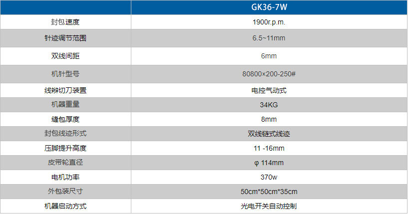 GK36-7W全自動(dòng)雙針?biāo)木€全自動(dòng)封包機(jī)采用雙機(jī)針縫合,一次縫兩趟線,牢固可靠,可實(shí)現(xiàn)無(wú)泄漏封包,適合于對(duì)縫口有嚴(yán)格要求的廠家對(duì)紙袋、塑編袋、布袋等的封包縫口。采用 光電開關(guān)自動(dòng)控制啟停機(jī)、電控氣動(dòng)式切刀自動(dòng)剪切線辮,適合于自動(dòng)化程度較高的化工廠、倉(cāng)庫(kù)、碼頭等流水線縫包。